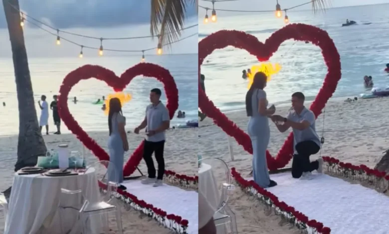 El video, que circula en TikTok, muestra el instante en que llevan a la novia con una venda en los ojos y la guían a través de un pasillo frente a la playa hasta dejarla en un escenario donde previamente habían montado un corazón hecho de rosas rojas teniendo el mar de fondo. Allí la esperaba su prometido con la sortija.
